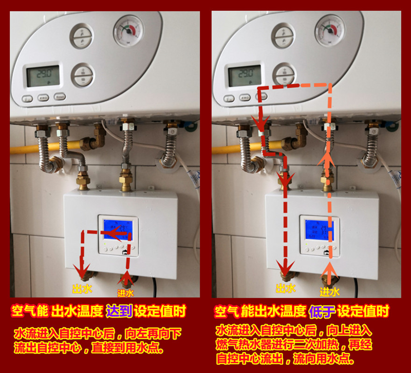 設置好自控中心和燃氣熱水器水溫,當空氣能出水溫度高于自控中心設置水溫時,空氣能的出水從自控中心右下口,向左從左下口直流用水點,不流經燃氣熱水器;當空氣能出水溫度低于自控中心低于設置水溫時,水流向上流經燃氣熱水器二次加熱,再從燃氣熱水器熱水出口流經自控中心,再從左下口流向用水點。只要設置水溫,全程智能控制,無需手動切換水閥。備注:建議自控中心設置為用熱水最低的溫度比如40°C,燃氣熱水器設置為55-60°C